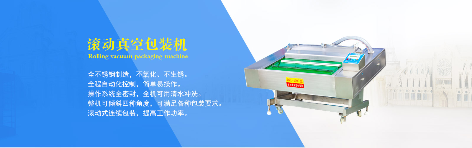 公司专业制造生产真空包装机、拉伸膜真空包装机、盒式真空包装机、斩拌机、滚揉机、盐水注射机、巴氏杀菌流水线等食品机械。其中生产的DZL-420全自动拉伸膜真空包装机、DZL-1000型连续自动真空包装机、真空滚揉机、斩拌机、盐水注射机等都是通过本市技术监督局检验合格的产品。